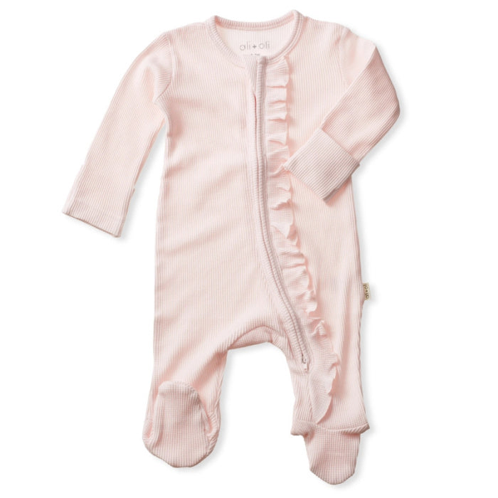 - Pink Waffle Knit Ruffle Footie with 2-Way Zipper. This adorable ruffle footie features a soft two-way zipper with a covered interior and exterior, plus a neck protector to prevent irritation. The tagless design has size info stamped onto the fabric for added comfort. Made with Oeko-Tex-certified, azo-free dyes, this breathable footie includes fold-over mittens for scratch prevention. Size 3-6 M.