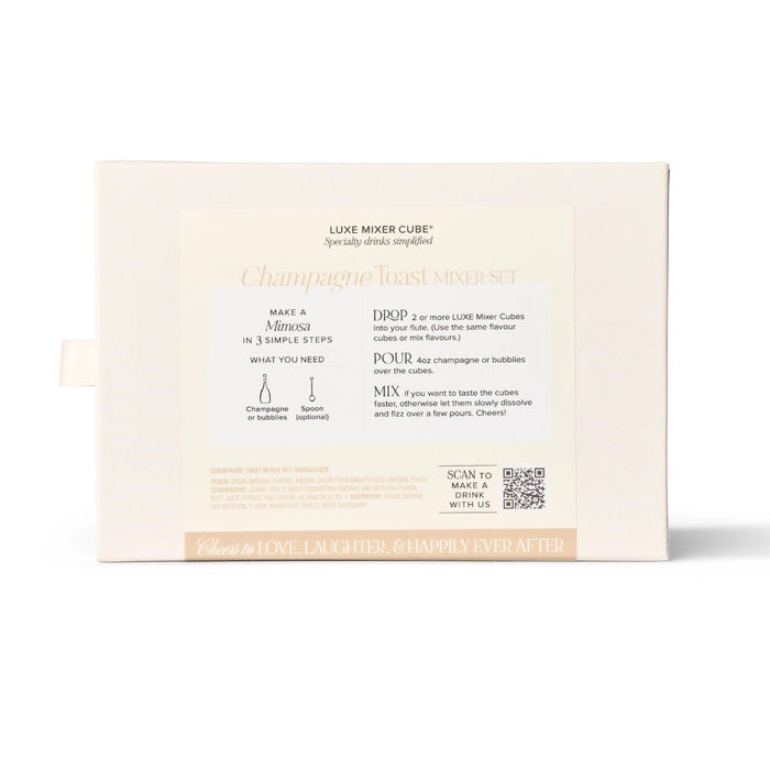 Inside, you'll find our handcrafted LUXE Mixer Cubes, infused with natural flavors that turn champagne into elegant mimosas, mocktails, or artisan-flavored cocktails. Each LUXE Mixer cube is designed to enhance the taste of your bubbly, making every sip a celebration.